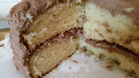The recipe makes a 9 inch round cake.....I think I might take half of it to my aunt's house tomorrow which will leave half the temptation at our house. Lol